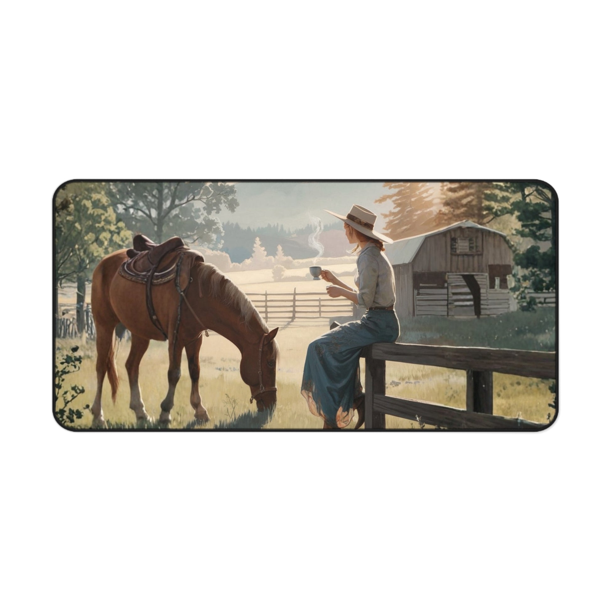 Spread across your workspace like sunlit canvas, this Cowgirl Painting desk mat brings lively western charm to every task. Soft neoprene cushions your wrists while a vivid painted cowgirl scene anchors your desk — boots tapping, fringe in motion, colors that pop against keyboards and sketchpads. It stays put with a textured non-slip backing, yet feels gentle under pens, mice, and wrists. Use it as a stable surface for writing lists, drafting designs, or laying out crafts; the sewn hem keeps the print crisp and the edges durable through daily use. Sized to fit laptop stations or wider setups, it turns routine work into a little moment of frontier spirit and color.