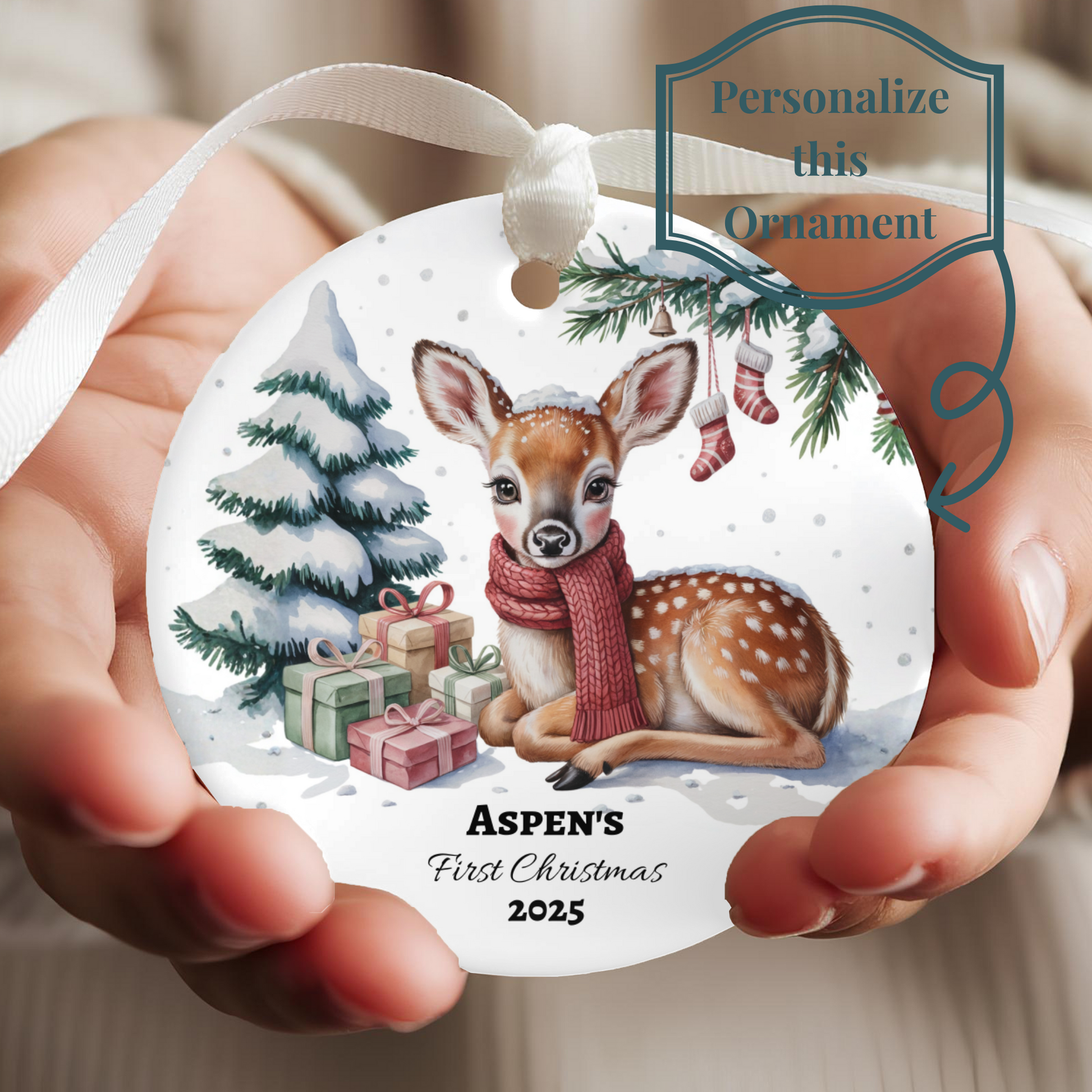 Custom Ceramic Christmas Ornament Baby First Christmas Decor Personalized Deer Ornament Nursery Holiday Tree Keepsake